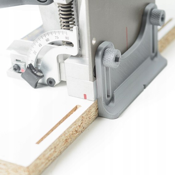 Drukowana przykładnica kątowa z serii LamelMate™, która na wzór rozwiązania zastosowanego w oryginalnej frezarce Lamello (przykładnica 251044) umożliwi frezowanie lamelownicą Dewalt DW682 w pozycji pionowej oraz blisko krawędzi płyty.